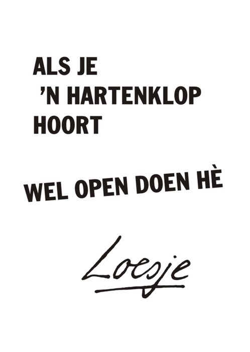Witte liefdeskaart van Loesje. Op de voorkant staat de tekst: Als je 'n hartenklop hoort wel open doen he.