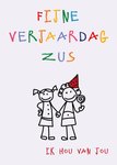 Leuke verjaardagskaart met illustratie en de tekst: Fijne verjaardag zus. Ik hou van jou.
