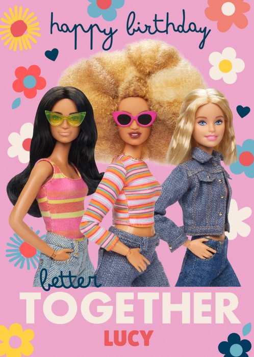 Kleurrijke verjaardagskaart met bloemen, paarse achtergrond, barbiepoppen en de tekst: 'Happy Birthday. Better together'. Verras iemand met deze mooie verjaardagskaart van Barbie en Danilo.