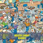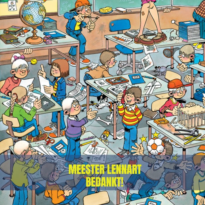 Grappige kaart van Jan van Haasteren om iemand mee te bedanken. Op de kaart staat 'Meester Lennart bedankt!' geschreven.