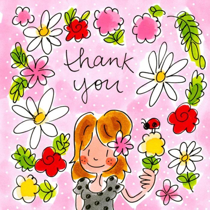 Bedankkaartje van Blond Amsterdam met een meisje die een bloemetje in haar hand heeft. Om haar heen zie je allemaal bloemetjes en plantjes.