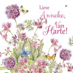 Wie ga jij verrassen met deze klassieke en schattige kaart van Janneke Brinkman? Op de kaart zie je allemaal bloemen en vlinders. Ook staat er de tekst: van harte! Je kunt de naam van de ontvanger aan de kaart toevoegen.