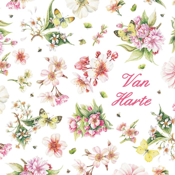Zoals de collectie van Janneke Brinkman doet verwachten staat de kaart vol met bloemen. Door goed te kijken zijn er enkele vlinders te ontdekken. Ook aan de binnenkant staan bloemen.