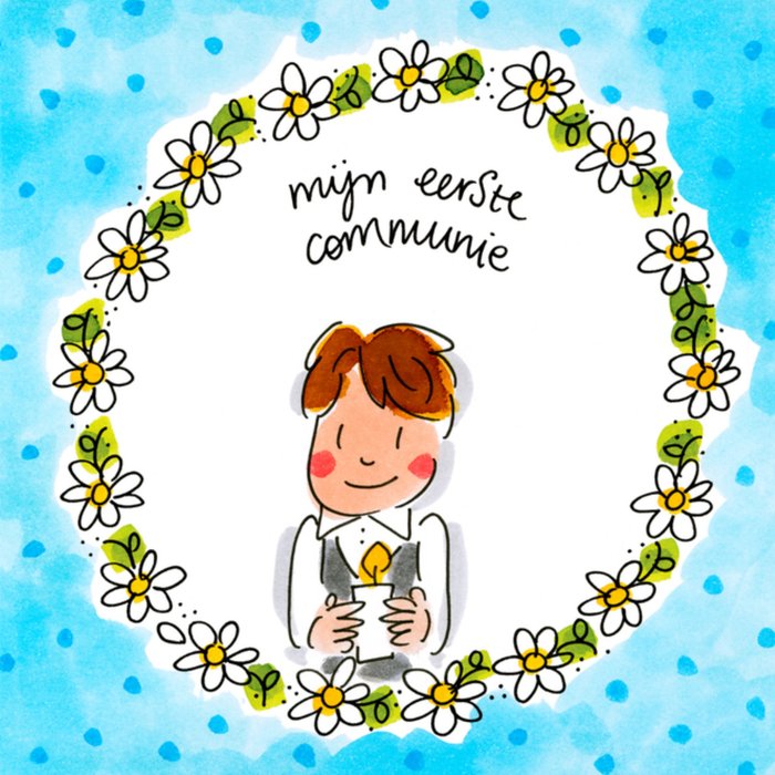 Een leuke kaart van Blond Amsterdam waarop een jongetje in het midden een kaarsje vast pakt met de tekst: Mijn eerste communie.