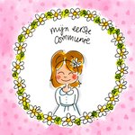 Een leuke roze kaart van Blond Amsterdam waarop een meisje in het midden lief glimlacht met de tekst"Mijn eerste communie.