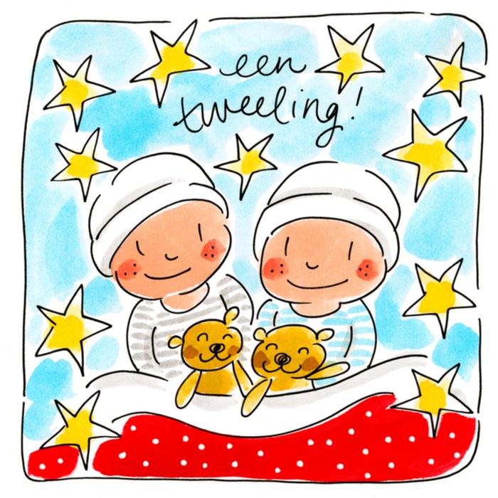 Een leuke kaart voor de geboorte van een tweeling ontworpen door Blond Amsterdam waarbij 2 jongetjes zijn getekend. Dubbel geluk!