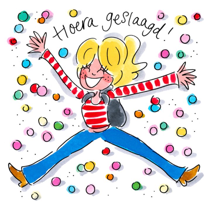 Stuur deze vrolijke kaart van Blond Amsterdam naar iemand die geslaagd is. Op de kaart staat de tekst: Hoera geslaagd!
