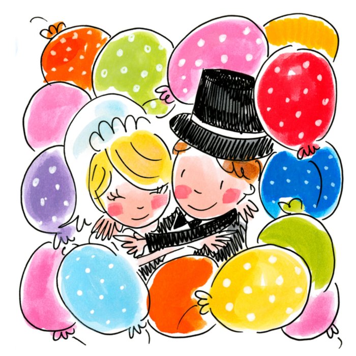 Een leuke en kleurrijke Blond Amsterdam kaart waarop een koppel tussen de ballonnen is getekend.