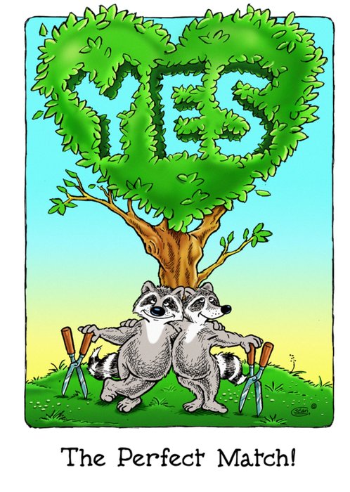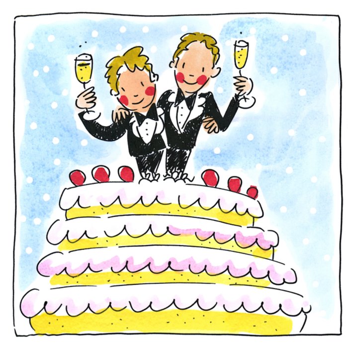Vrolijke kaart uit de collectie van Blond Amsterdam met een mannelijk bruidspaar op een smakelijke bruidstaart,