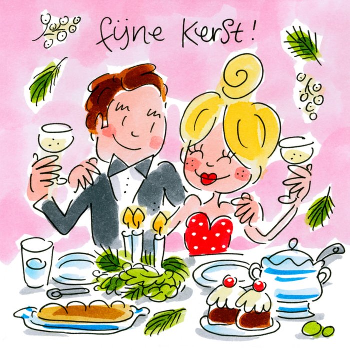 Kerstkaartje van Blond Amsterdam met een schattig stel dat glimlachend aan hun kerstdiner zitten.