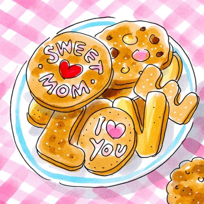 Leuke moederdagkaart met illustratie van koekjes.