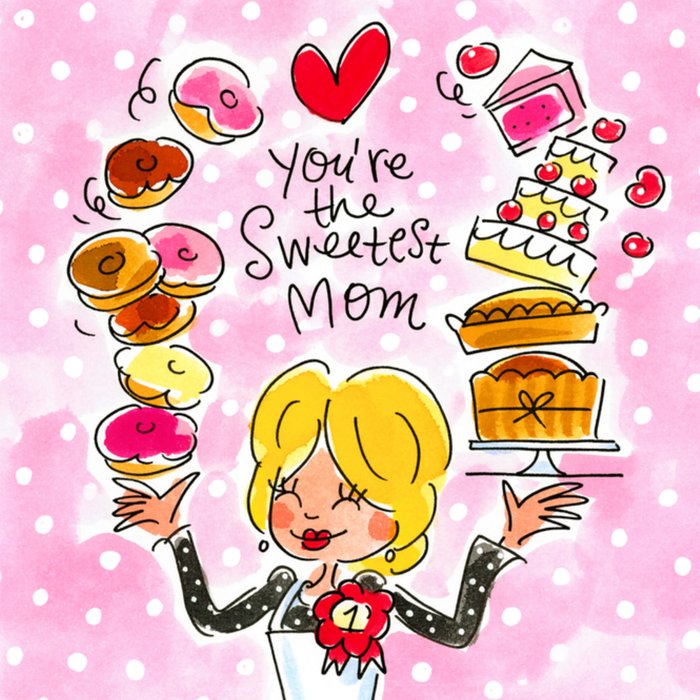 Op deze roze kaart is een moeder afgebeeld met alemaal lekkere gebakjes. De moeder heeft een button op met daarop een 1. De kaart is afgemaakt met de tekst "you're the sweetest mom".