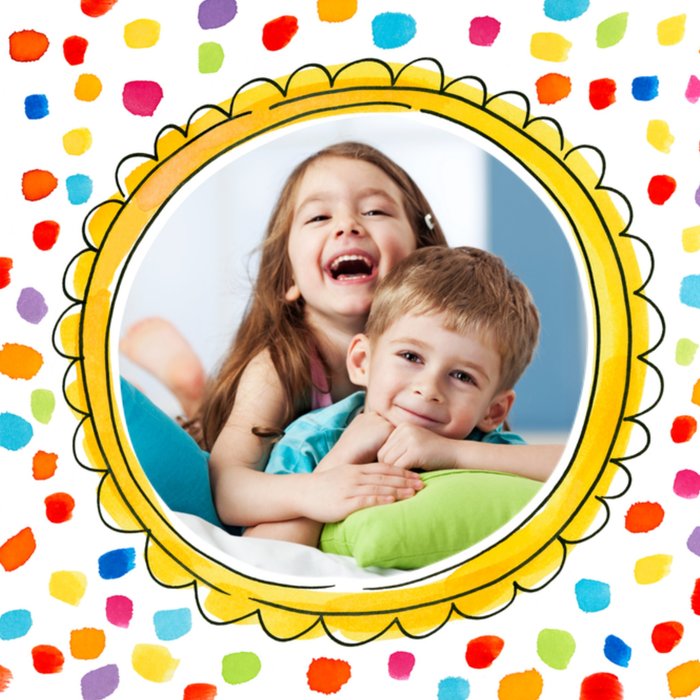 Nodig iedereen uit voor een gezellig feestje met deze kleurrijke kaart met een jouw eigen foto!