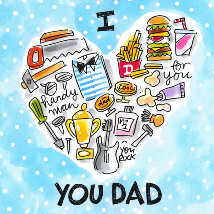 Op deze blauwe kaart is een groot hart afgebeeld met daarin allemaal verschillende illustraties die bij een vader horen.