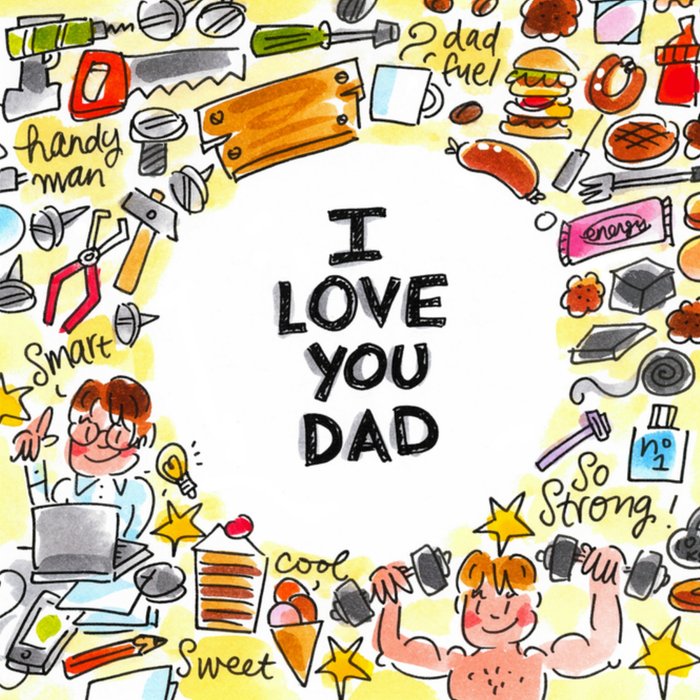 Op deze kaart staat er in de witte cirkel in het midden groot geschreven "I love you dad". Daar omheen zijn er verschillende kleine illustraties en teksten.