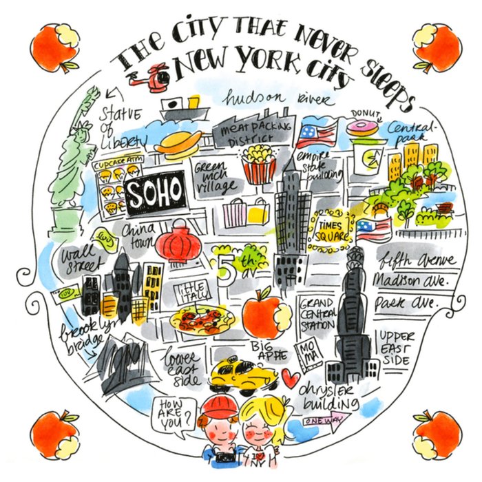 De groetjes doen vanuit New York City? Verstuur dit illustratiekaartje met alle typische highlights uit the city that never sleeps.