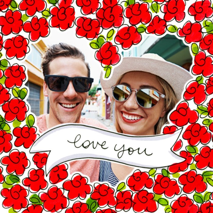 Leuke fotokaart van Blond Amsterdam voor Valentijnsdag. Om de foto heen zie je allemaal rode bloemen. Ook zie je de tekst: love you.
