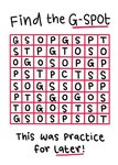 Typografische valentijnskaart met een woordzoeker en de tekst: 'Find the G-Spot. This was practice for later!'. Verras iemand met deze grappige valentijnskaart van Blue Kiwi.