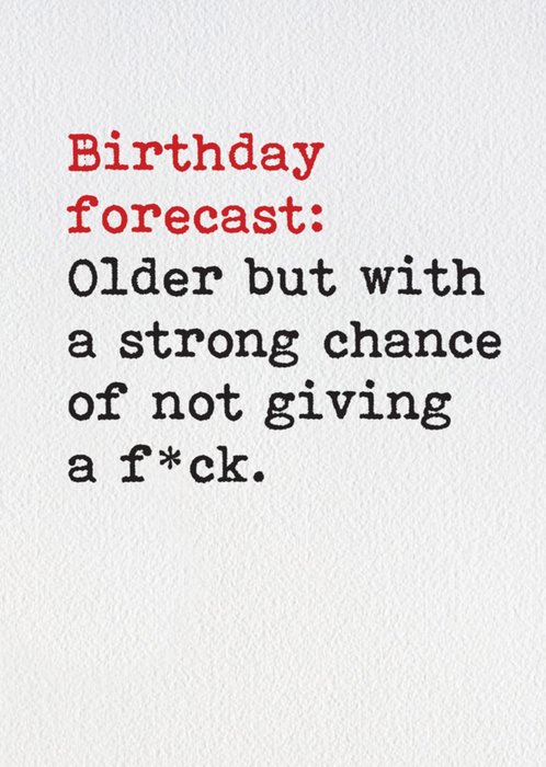 Grappige verjaardagskaart met de tekst: Brithday forecast: Older but with a strong chance of not giving a f*ck.