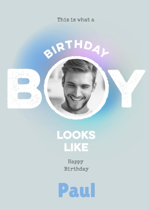Wens een fijne verjaardag met deze leuke kaart van Brightspot. Op de kaart kun je een foto toevoegen en staat er de tekst: This is what a birthday boy looks like. Happy birthday [Naam].