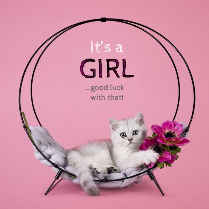 Fotografische geboortekaart met een kat, bloemen en de tekst: 'It's a GIRL..good luck with that'. Verras iemand met deze grappige geboortekaart van Catchy Images.