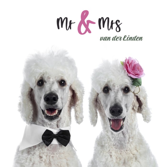 Leuke huwelijkskaart met poedels en aanpasbare naam.