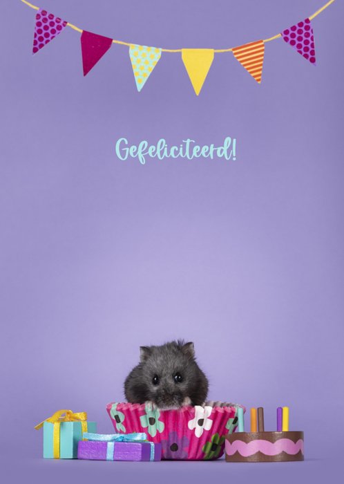 Lieve verjaardagskaart met hamstertje en cadeautjes.