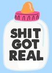 Leuke illustratie van een baby flesje en de tekst: Shit got real