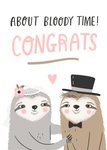 Leuke huwelijkskaart met illustratie en de tekst: About bloody time! Congrats