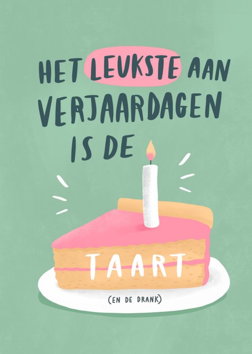 Leuke verjaardagskaart met illustratie en de tekst: Het leukste aan verjaardagen is de taart (en de drank)