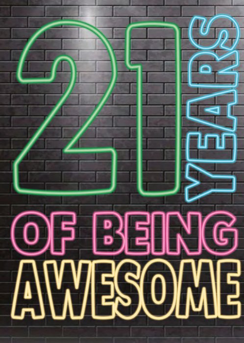 Op deze leuke verjaardagskaart staat: 21 years of being awesome.