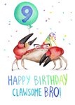 Een verjaardagskaart met een krab die een leeftijdsballon vastheeft met het cijfer 9 en de tekst: Happy birthday clawsome bro!