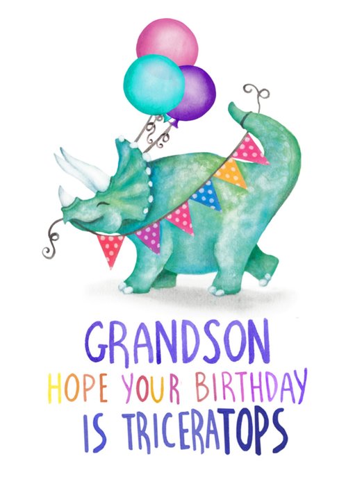 Schattige verjaardagskaart met de woordgrap: Grandson hope your birthday is TriceraTOPs. Op de kaart staat de afbeelding van een Triceratops.