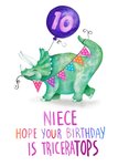 Schattige verjaardagskaart met de woordgrap: Niece hope your birthday is TriceraTOPs. Op de kaart staat de afbeelding van een Triceratops.