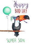 Grappige verjaardagskaart met een toekan en de tekst: Happy bird day super son.
