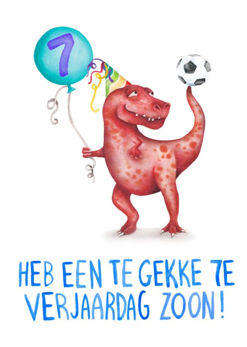 Grappige verjaardagskaart met een dino en de tekst: heb een te gekke 7e verjaardag zoon!