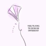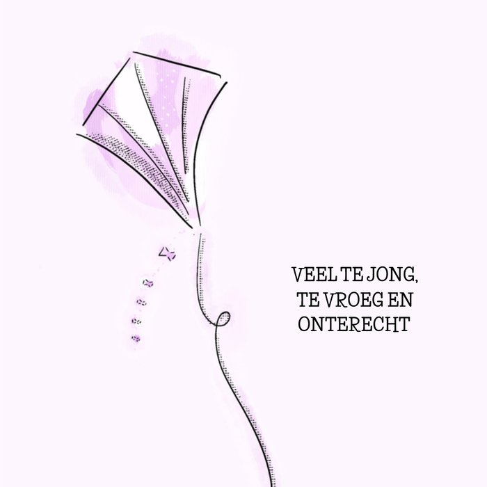 Een condoleance kaart met een getekende vlieger voor een meisje. Op de kaart staat de tekst: "Veel te jong, te vroeg en onterecht."