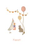 Typografische verjaardagskaart met een eendje, katje, cadeautjes, ballonnen en de tekst: 'Feest!'. Verras iemand met deze leuke verjaardagskaart van Dagelijkse Broodkruimels.