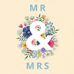 Fleurige huwelijkskaart met de tekst: Mr & Mrs Leuke kaarten, gemaakt om vreugde te verspreiden. Dat zijn de designs van Dalia Clark Design.