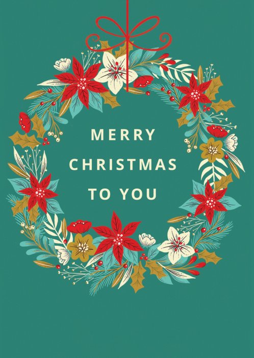 Kerstkaart met kerstkrans en de tekst: Merry Christmas to you