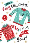 Vrolijke kerstkaart met kersttruien en de tekst: Have a cosy christmas & a fab new year!