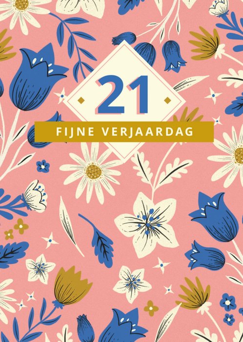 Fleurige verjaardagskaart met bloemen en de tekst: 21 fijne verjaardag.