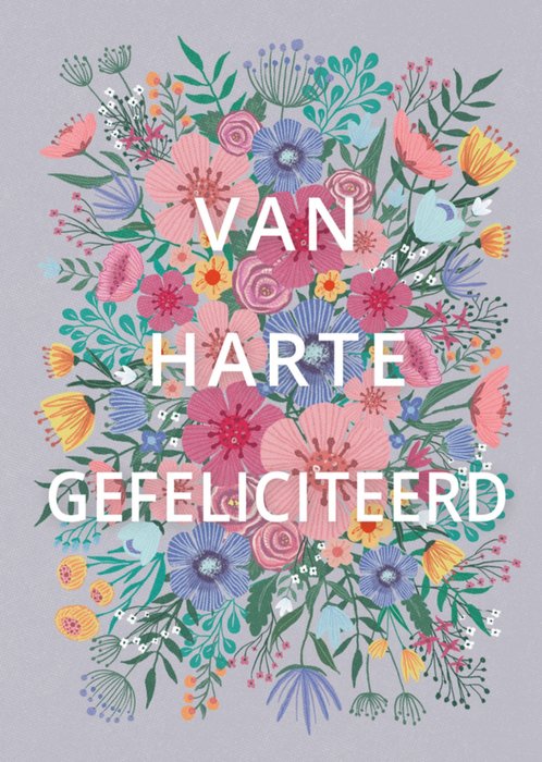 Op deze fleurige verjaardagskaart staat: Van harte gefeliciteerd.