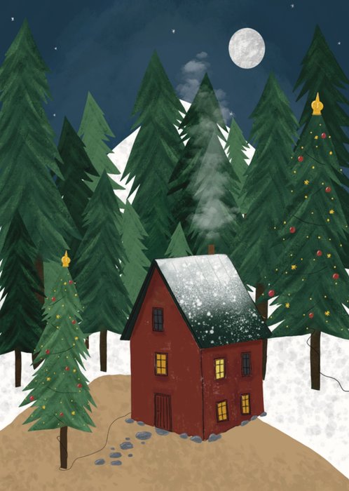 Illustratieve kerstkaart met een sterrenhemel boven een besneeuwd bos, een huisje en kerstboom. Verras iemand met deze leuke kerstkaart van De Merkwaarde Studio.
