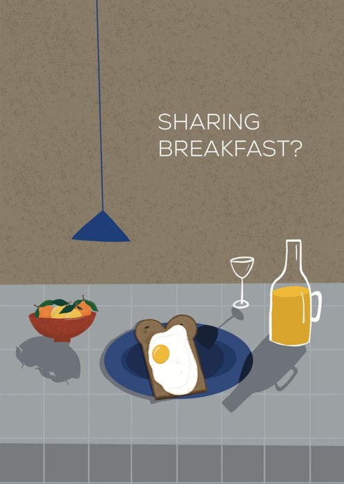 Illustratieve valentijnskaart met ontbijt en de tekst: 'Sharing breakfast?'. Verras iemand met deze lieve valentijnskaart van De Merkwaardige Studio.