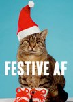 Grappige kerstkaart met een boos kijkende kat met kerstmuts. Op de kaart staat: Festive af.