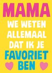 Grappige Moederdagkaart met de tekst: Mama we weten allemaal dat ik je favoriet ben.