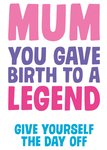 Grappige moederdagkaart met de tekst: Mum you gave birth to a legend give yourself the day off.