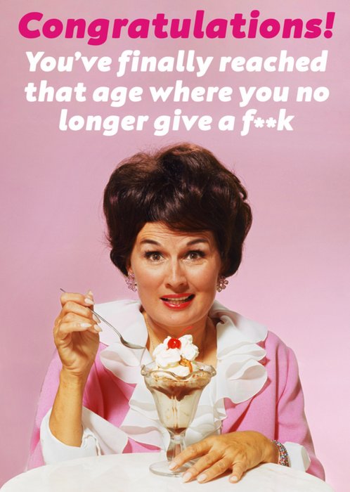 Grappige verjaardagskaart met een retro tintje. Op de kaart staat: Congratulations! You've finally reached that age where you no longer give a f**k