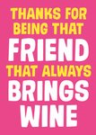 Leuke verjaardagskaart met de tekst: Thanks for being that friend that always brings wine.